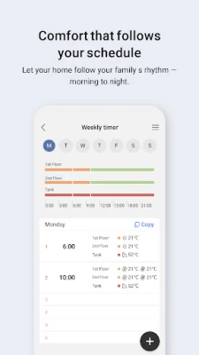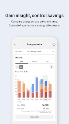 Miej pełen wgląd i kontrolę nad swoim systemem. Aplikacja pozwala monitorować bieżące temperatury – zarówno wewnętrzne, jak i zewnętrzne – oraz śledzić zużycie energii za pomocą przejrzystych wykresów, co sprzyja optymalizacji kosztów. Planuj komfort z wyprzedzeniem, korzystając z tygodniowego harmonogramu, który umożliwia ustawienie do sześciu operacji dziennie, idealnie wpisując się w Twój rytm życia. Bądź zawsze informowany o kondycji swoich urządzeń; natychmiastowe powiadomienia z kodami błędów pozwolą na szybką reakcję w przypadku jakichkolwiek nieprawidłowości. Pamiętaj, że dostępność funkcji może różnić się w zależności od modelu urządzenia i regionu użytkowania.